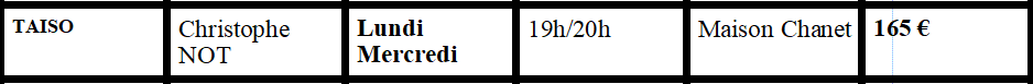 Christophe NOT vous enseigne le Taïso tous les Lundis soir entre 19h et 20h à la Maison Chanet. Le montant de la cotisation annuelle est de 165 €.